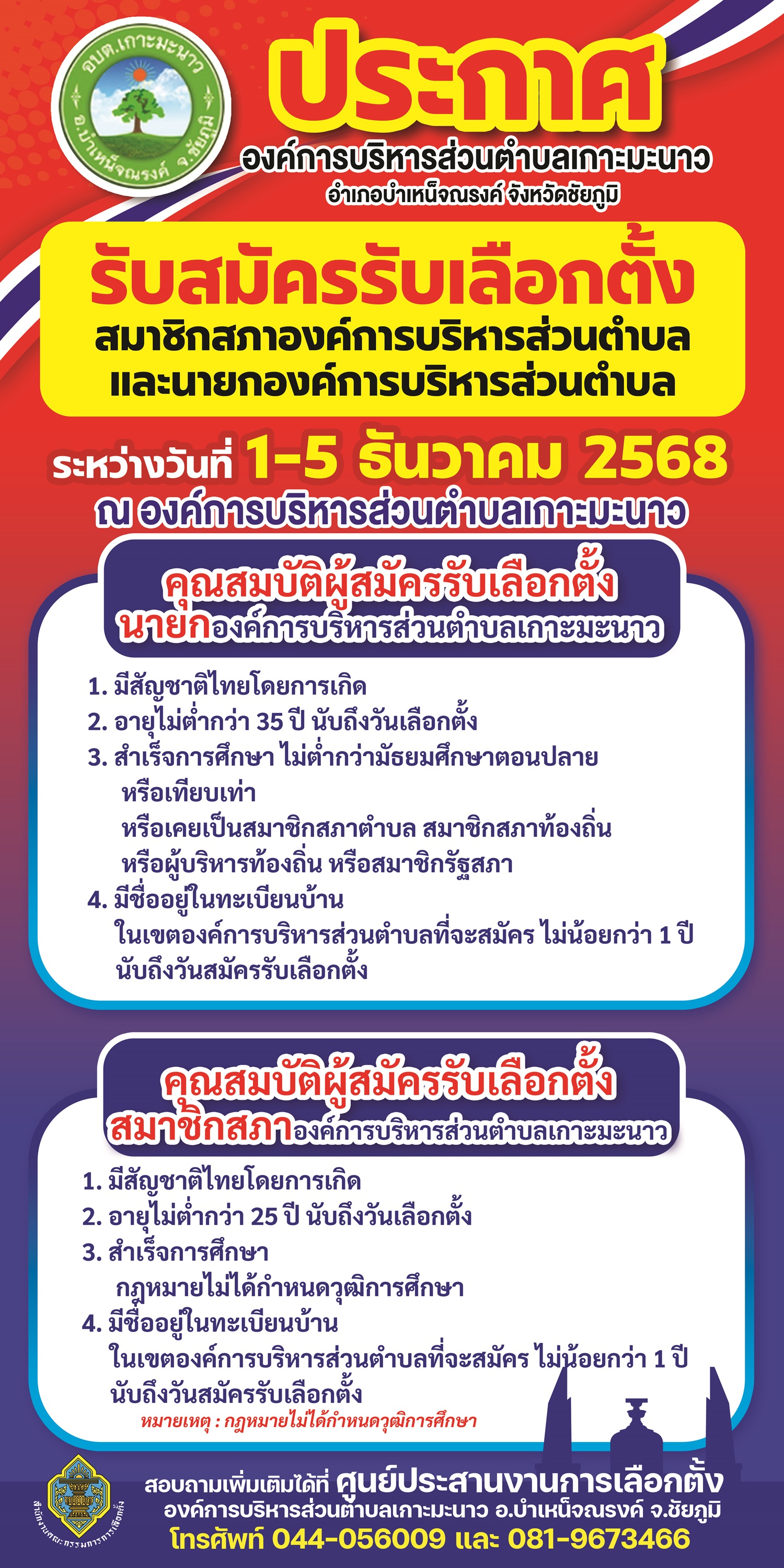 ประชาสัมพันธ์ องค์การบริหารส่วนตำบลเกาะมะนาว อำเภอบำเหน็จณรงค์ จังหวัดชัยภูมิ ประกาศรับสมัครรับเลือกตั้งสมาชิกสภาองค์การบริหารส่วนตำบลและนายกองค์การบริหารส่วนตำบล ระหว่างวันที่ 1-5 ธันวาคม 2568 ตั้งแต่เวลา 08.30-16.30 น.